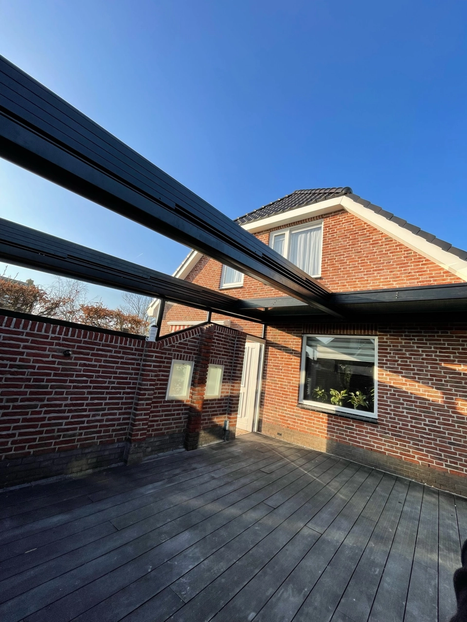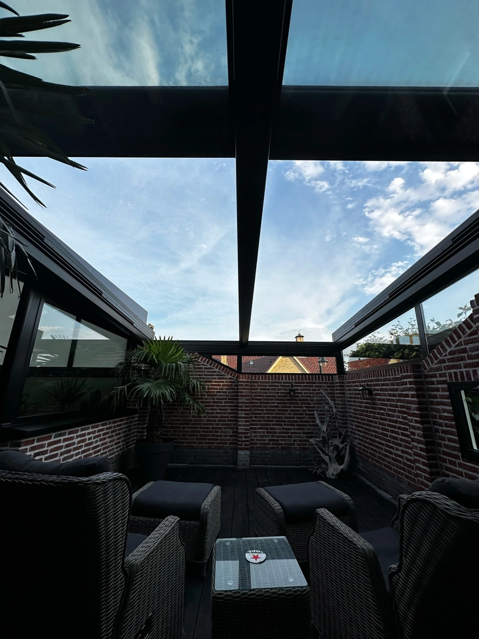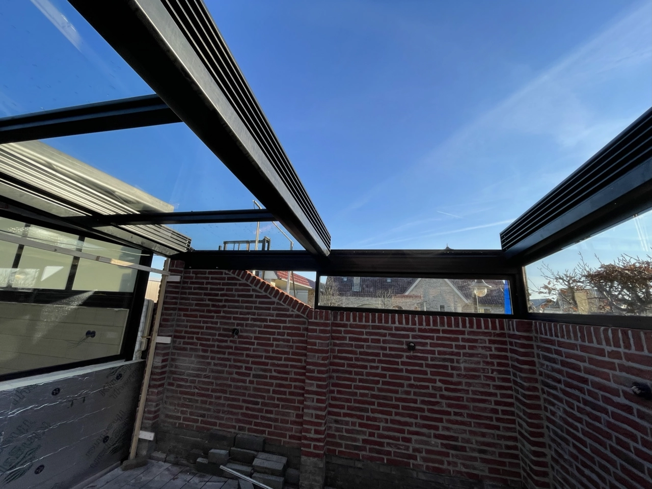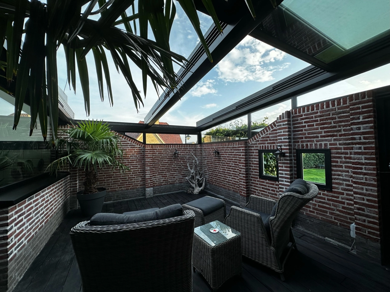 Naast deze serre hebben we het aansluitende terras overkapt met een automatisch glazen schuifdak. Aansluitend op het bestaande muurtje hebben we een aansluiting van vast glas gemaakt.