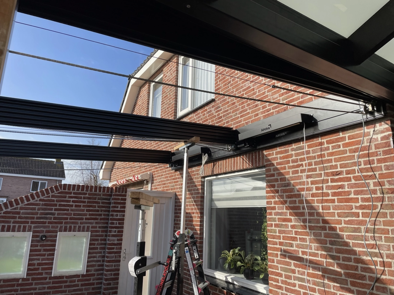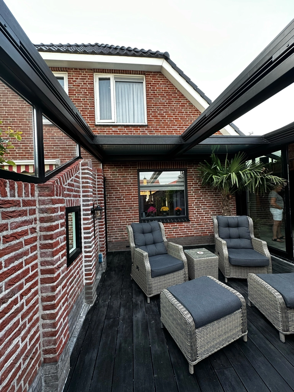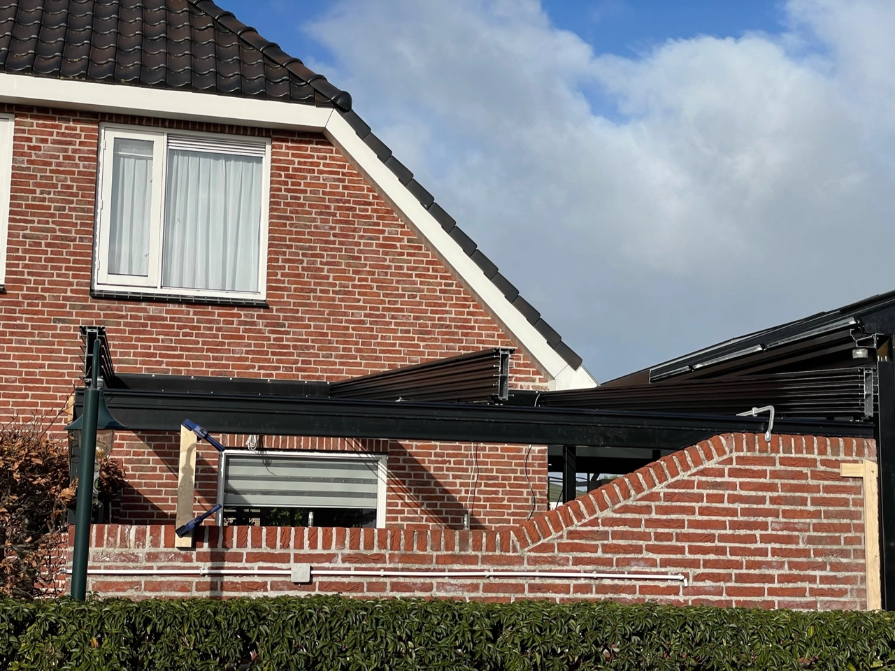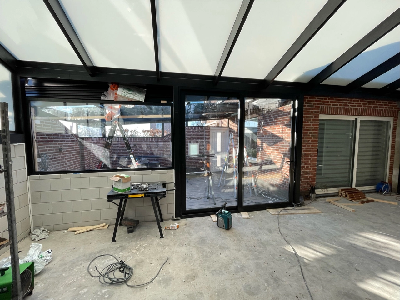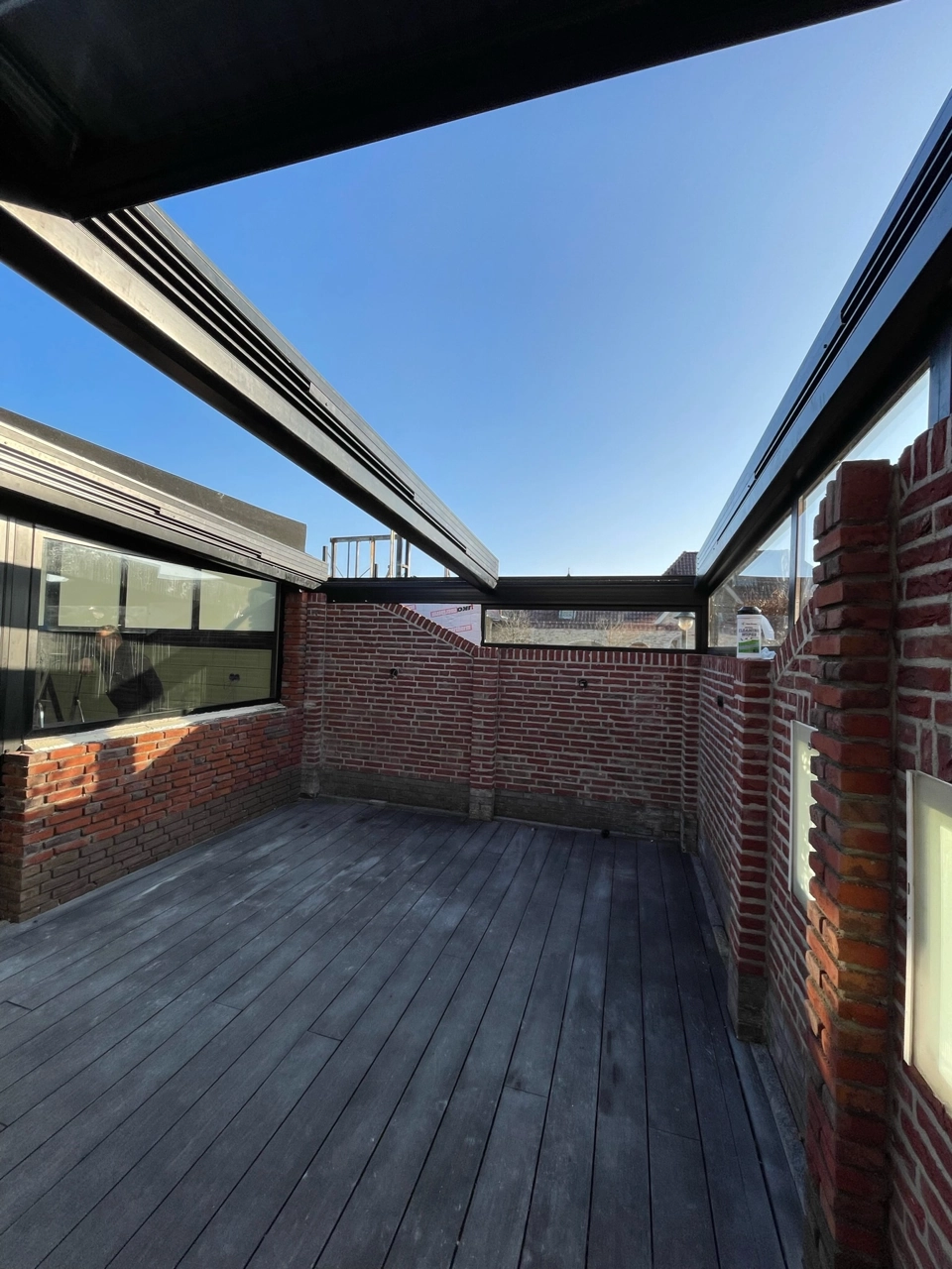 Naast deze serre hebben we het aansluitende terras overkapt met een automatisch glazen schuifdak. Aansluitend op het bestaande muurtje hebben we een aansluiting van vast glas gemaakt.