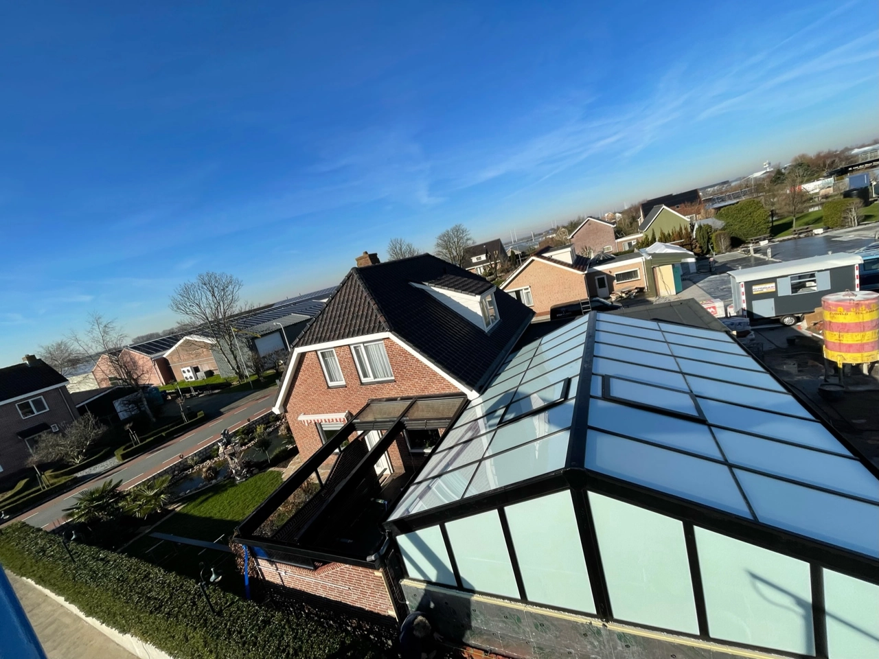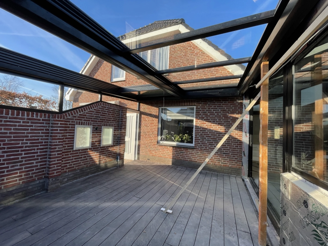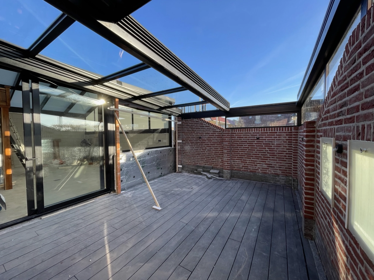 Het serre dak is voorzien van melkglas en 2 gemotoriseerde ramen, zo wordt de warmte in de zomer deels tegengehouden. De kopse kanten zijn voorzien van grote vaste spiekozijnen en aan de zijkant een stukje vast glas met een schuifpui.