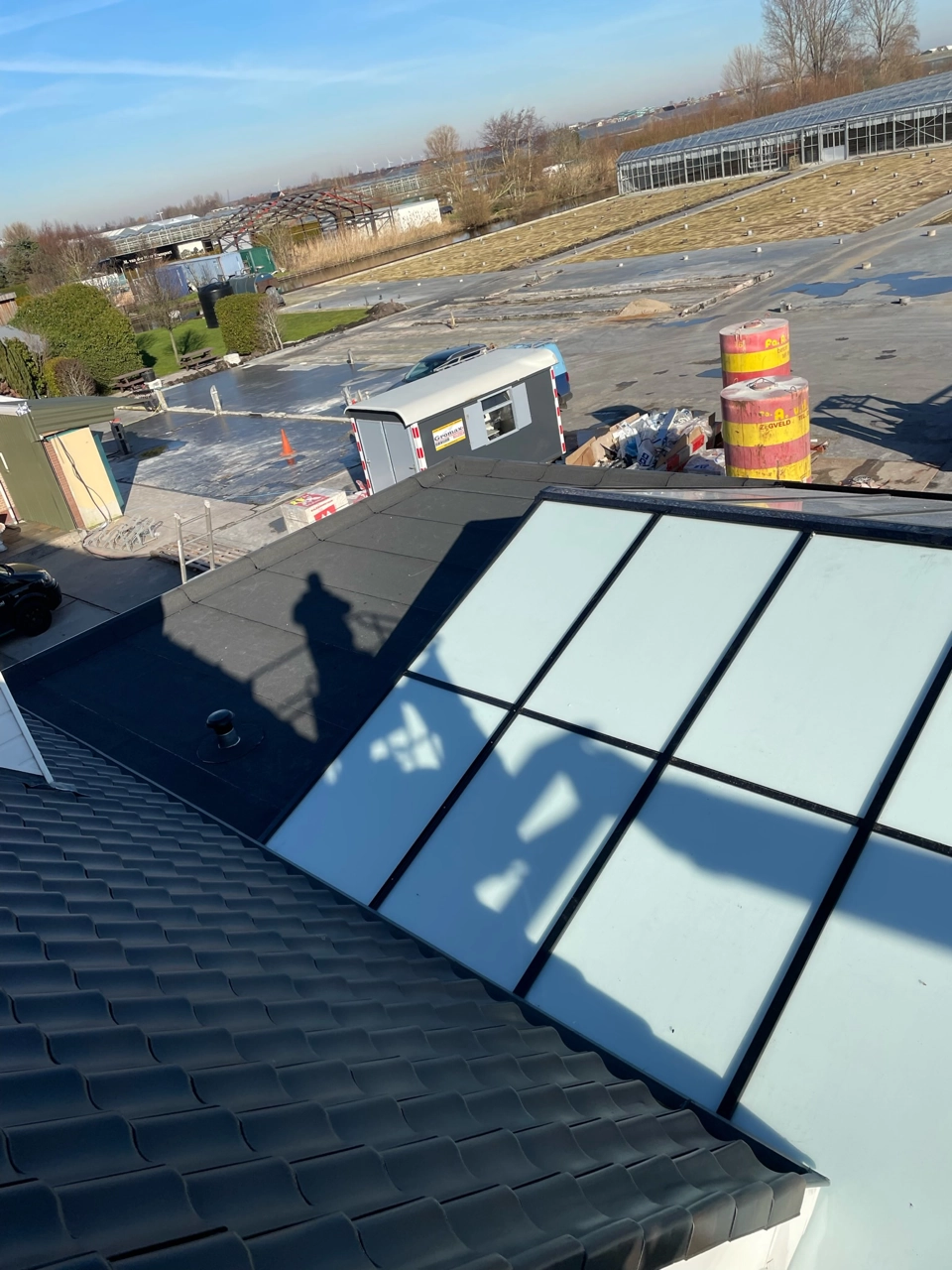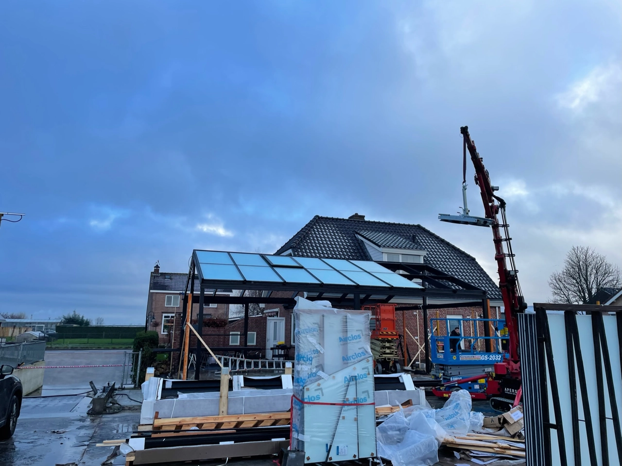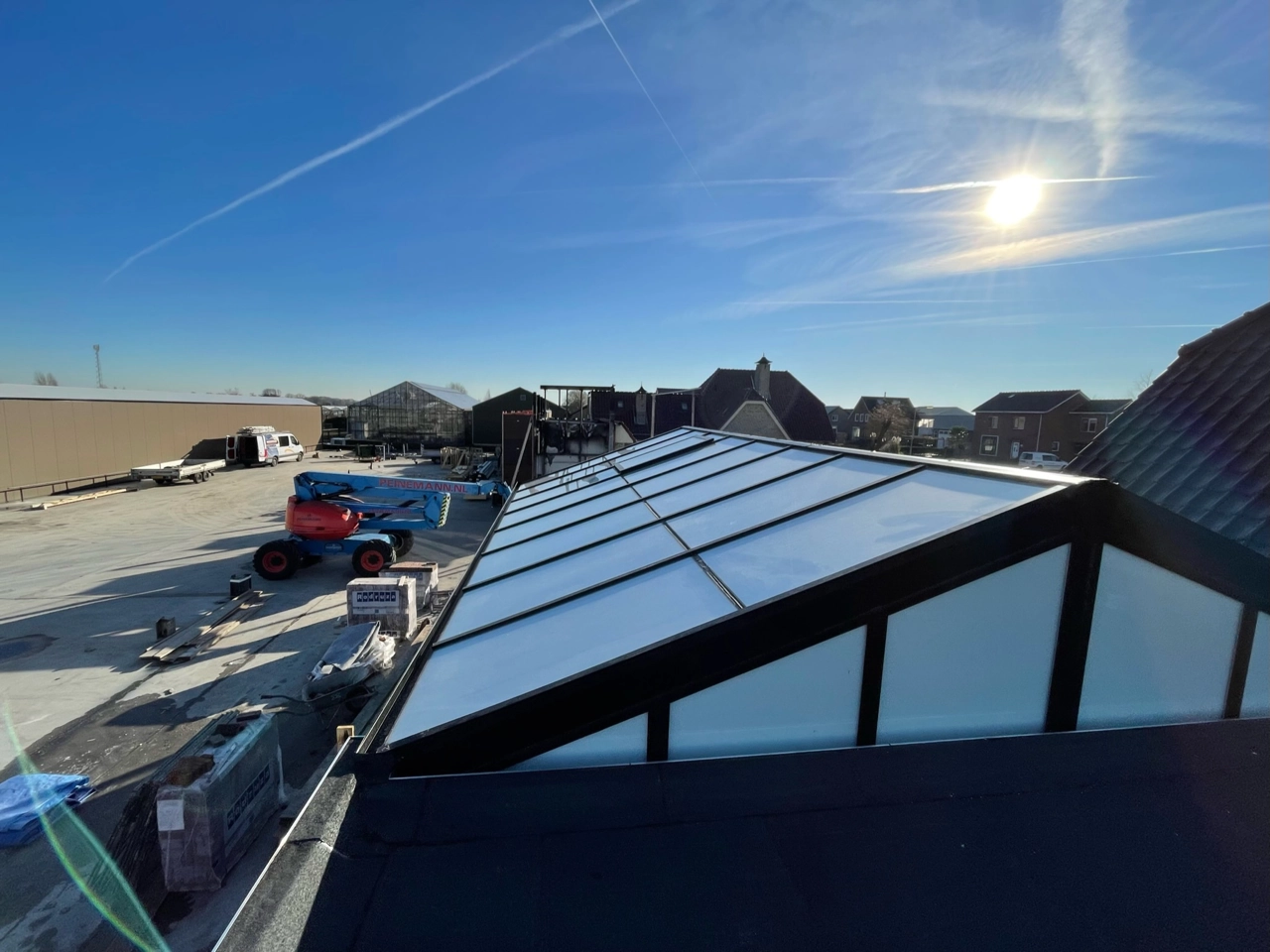 Het serre dak is voorzien van melkglas en 2 gemotoriseerde ramen, zo wordt de warmte in de zomer deels tegengehouden. De kopse kanten zijn voorzien van grote vaste spiekozijnen en aan de zijkant een stukje vast glas met een schuifpui.