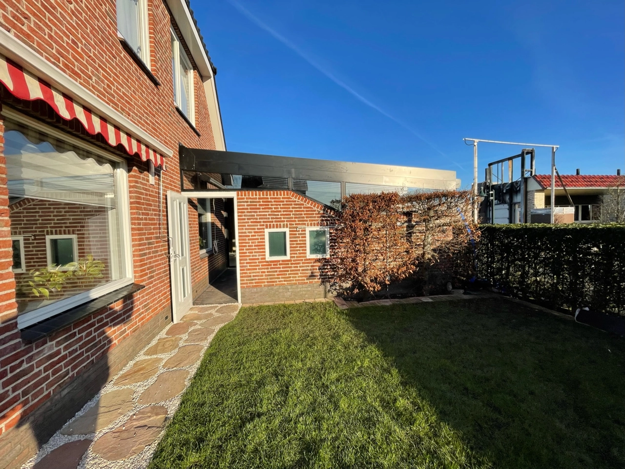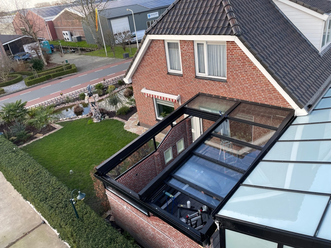 Serre en terrasoverkapping met automatisch glazen schuifdak in Roelofarendsveen
