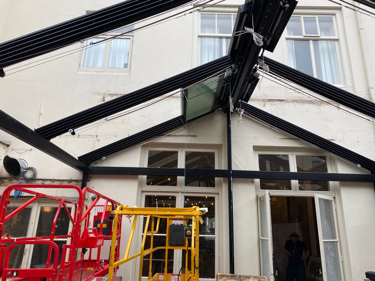 De doelstelling? Een glazen overkapping die de warmte in de zomer buiten houdt, terwijl de warmte in de winter juist binnen blijft. Daarnaast was de wens om het dak automatisch te kunnen openen en sluiten, met één druk op de knop.