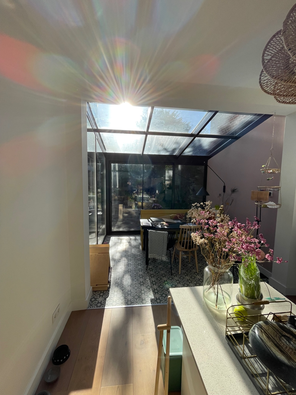 We realiseerden een glazen serre als aanbouw. Dat creëert extra vierkante meters én zorgt ervoor dat er veel meer licht naar binnen valt. We gebruikten aan één zijde de vaste gevel die er al stond. De serre lieten we daarop aansluiten, om de woning op een heel natuurlijke manier uit te breiden.