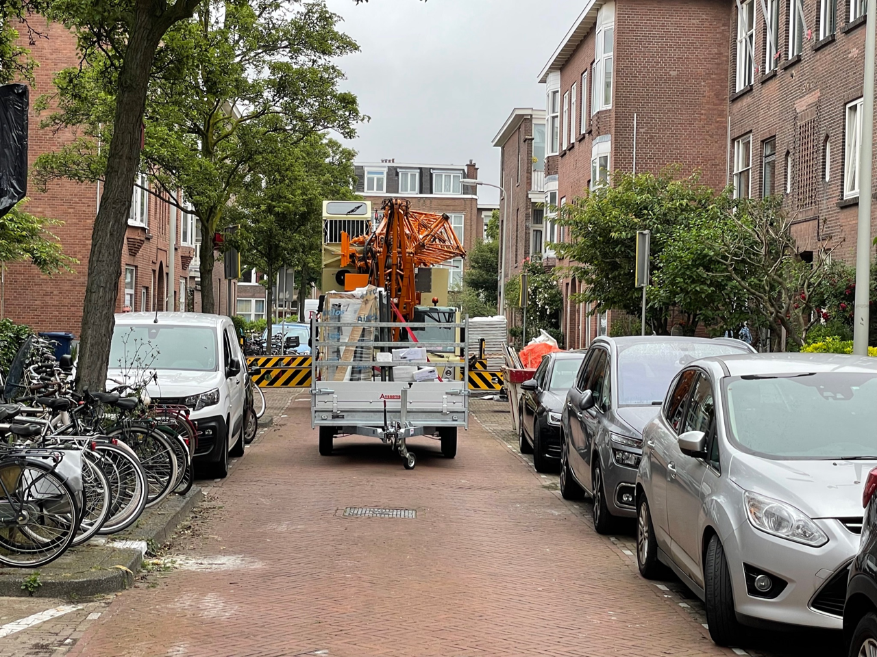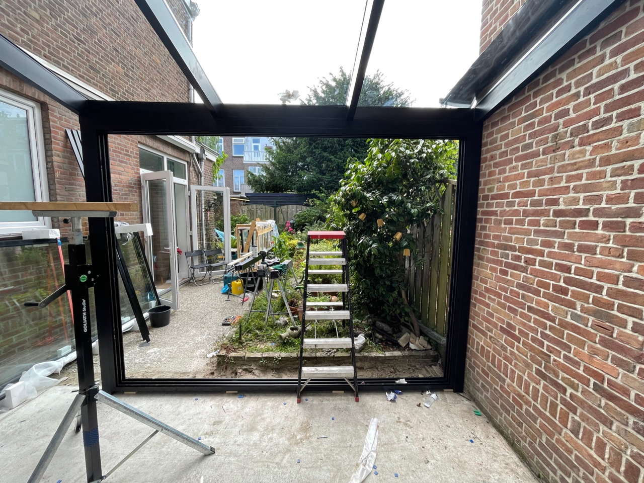 Een belangrijke uitdaging vormde de toegang tot de achterzijde van de woning. Het bleek niet mogelijk om achterom te gaan of door het huis heen te gaan. Daarom maakten we een plan om alle materialen óver het huis heen te verplaatsen. Dat lukt, waardoor we ondanks de beperkte ruimte een prachtige glazen serre konden realiseren.