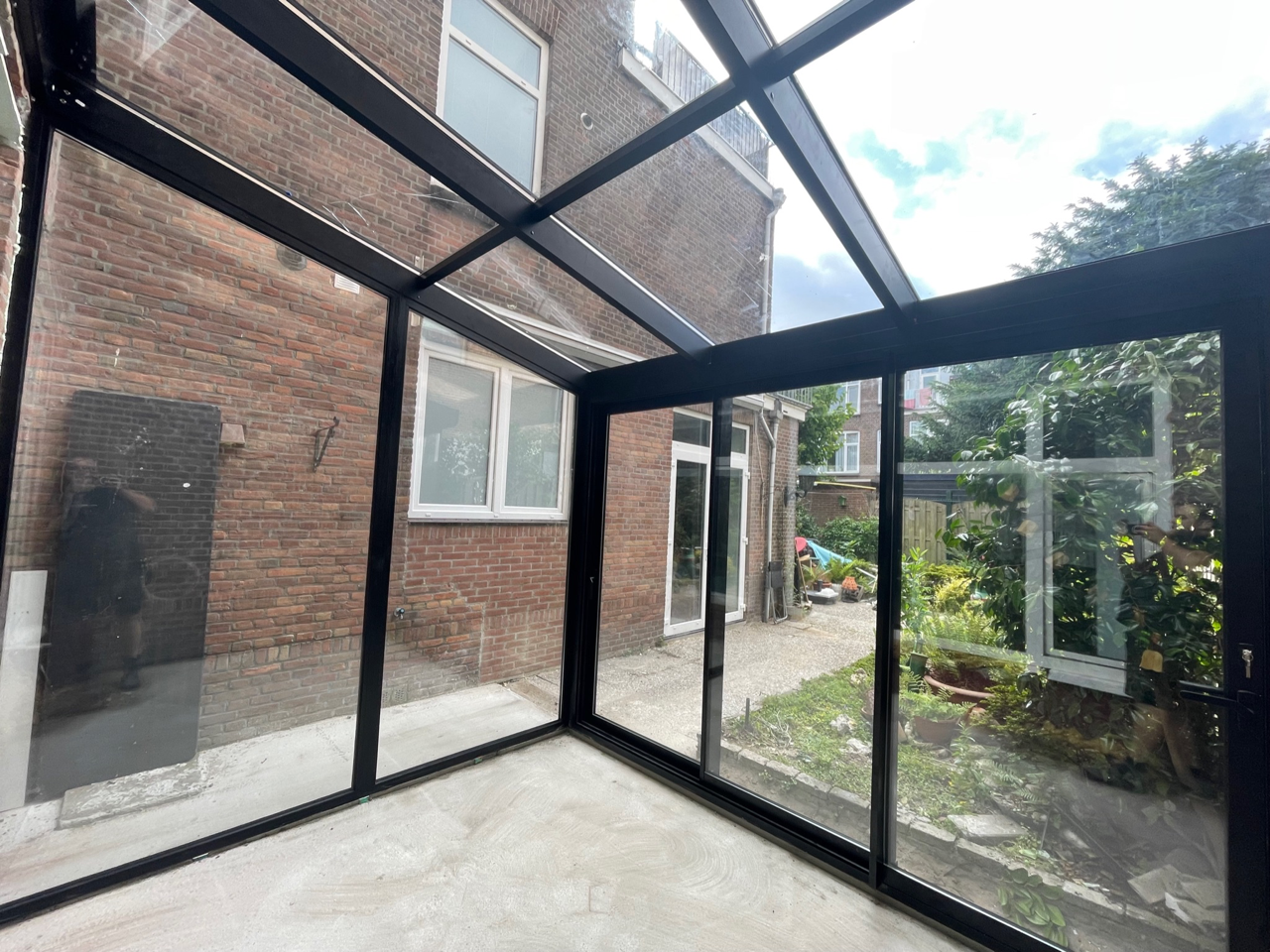 Een glazen serre als aanbouw laten realiseren? Dat deden we in Den Haag. De klant vroeg ons om een serre te plaatsen, met aan de voorzijde een schuifpui. Aan de zijkant realiseerden we een vaste glazen wand. Zonwering op het glazen dak van de serre voorkomt dat het tijdens de zomermaanden te warm wordt.